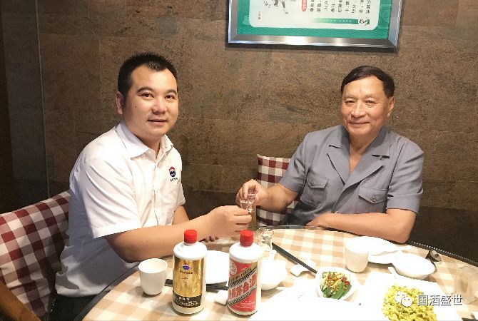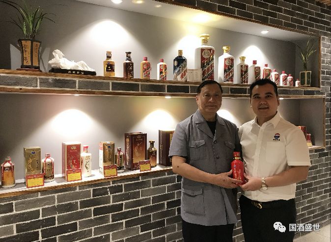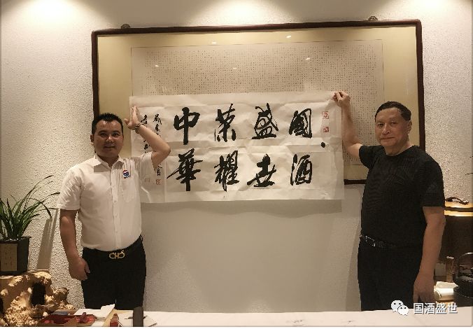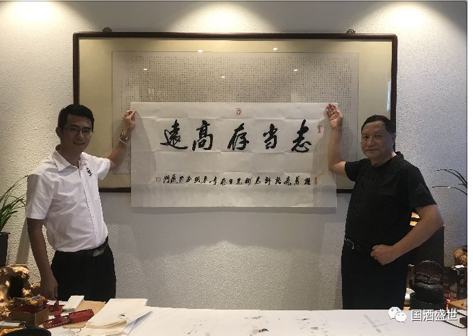 李春明将军和黄俊杰董事长在国酒盛世形象墙前合影